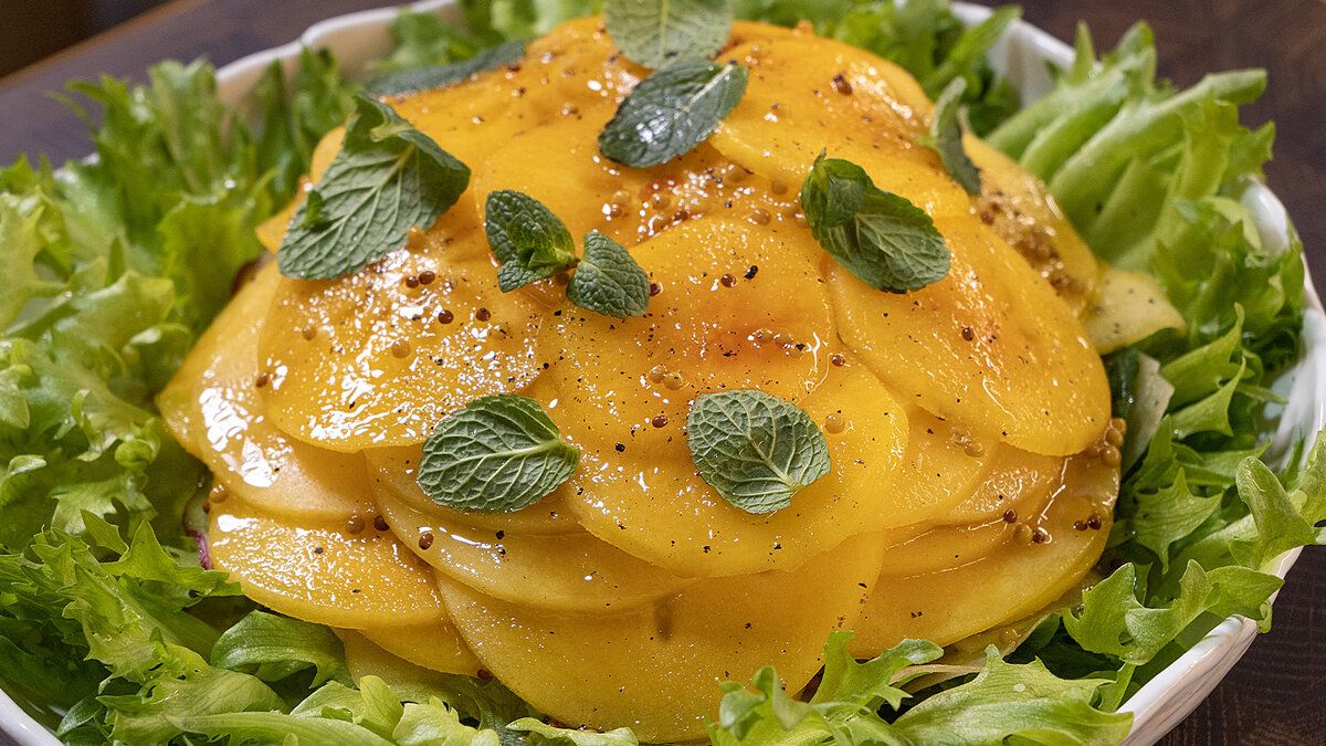 Горизонтом праздничной тарелки неожиданно становится яркость и свежесть: слой хурмы, салата и зелени создают эффектный контур вкуса без лишних хлопот.