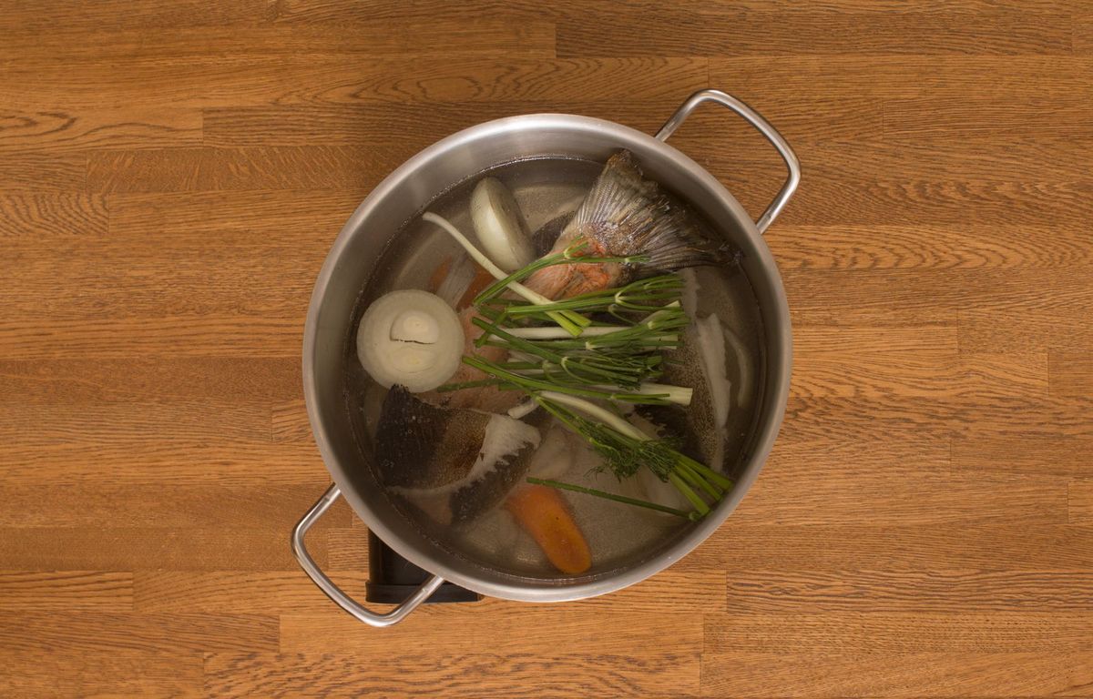 Белое вино придаёт бульону лёгкую кислотную ноту и раскрывает вкус рыбы, но можно заменить небольшим количеством лимонного сока. Для максимально прозрачного бульона процедить его охлаждённым — лишний жир осядет и его будет проще удалить. Бульон хранится в холодильнике 48 часов или годится для заморозки порциями на 2–3 месяца.