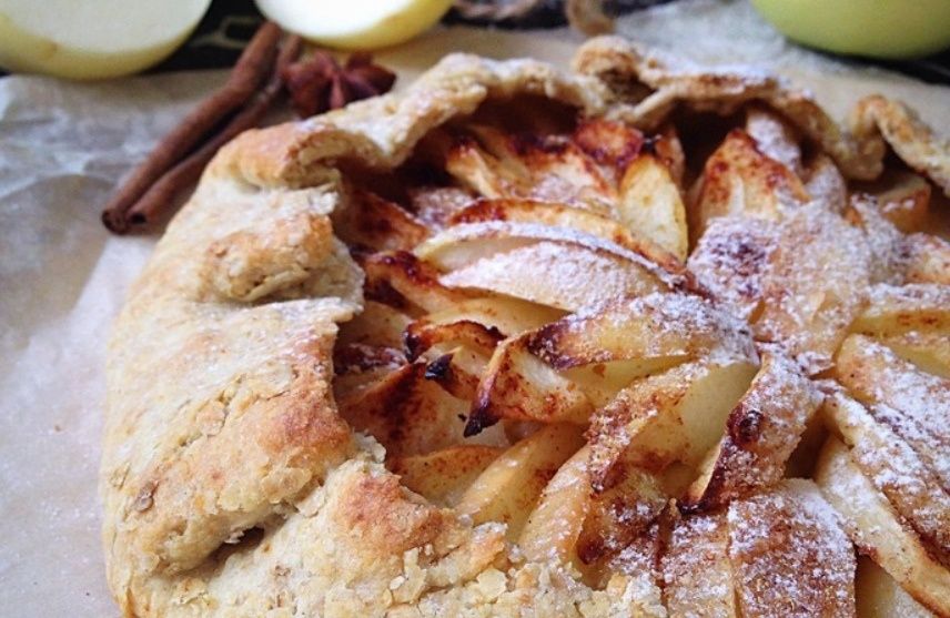 Ингредиенты и шаги в одном ритме: сначала сухие ингредиенты перемешать, затем соединить с жидкими и дать тесту отдохнуть. Раскатать, уложить на противень, уложить яблоки по кругу, приправить корицей и имбирём, защипнуть края и выпекать до золотистого цвета. Готовое изделие остужают и подают к столу.