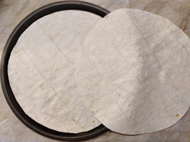 Перед началом готовки разогрейте духовку до 180°C. С помощью формы для выпечки вырежьте два круга из лаваша диаметром около 24 см. Для этого переверните форму, обрисуйте контур и аккуратно вырежьте его ножницами.