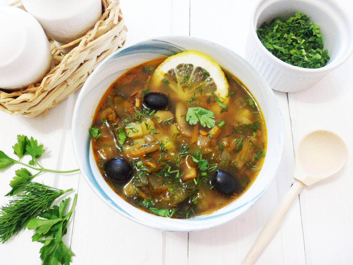 Перед подачей украсить солянку маслинами без косточек, кусочками лимона и зеленью. Грибная солянка готова к подаче на стол!