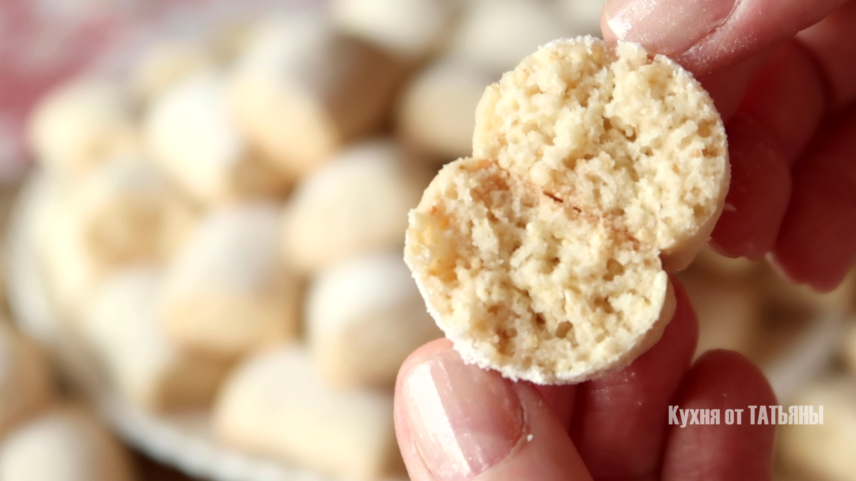 Тесто делится на четыре равные части, которые раскатываются в длинные бруски и затем нарезаются на небольшие кусочки. Формированные печенья выкладываются на противень и помещаются в заранее разогретую до 180 градусов духовку. Выпекать их необходимо около 15 минут, пока донышко не приобретёт золотистый цвет, а верх останется светлым и воздушным.
