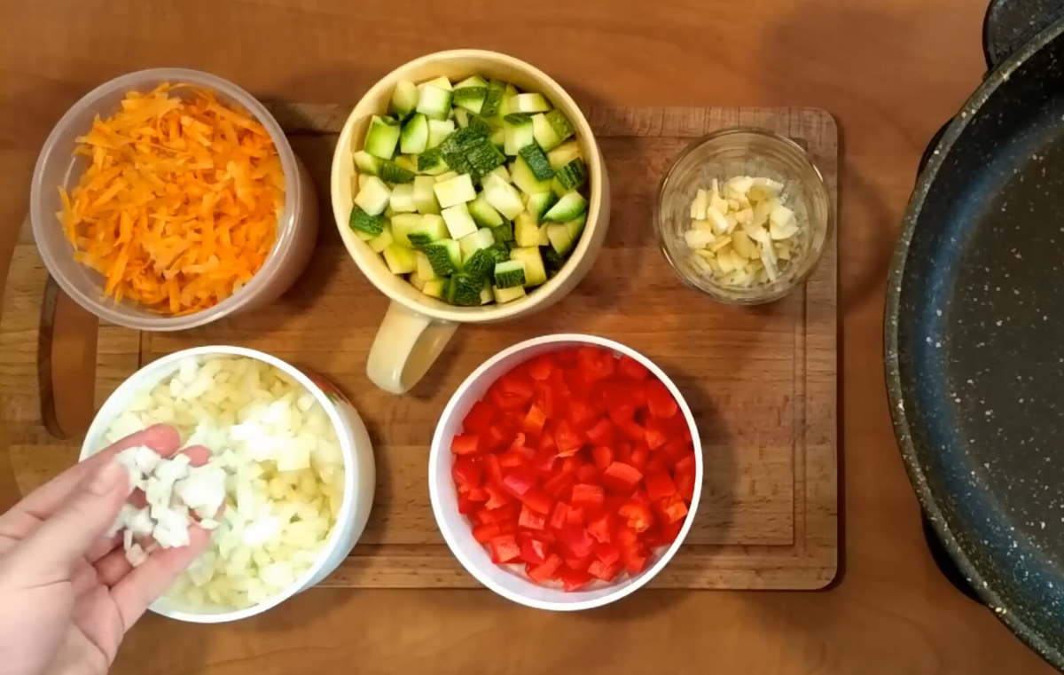 Но не ограничивайтесь только этими ингредиентами — можно добавить зеленую фасоль или брокколи по вкусу. Морковь лучше натереть на терке, а чеснок нарезать тонкими пластинками. Остальные овощи стоит порезать кубиками: кабачки — чуть крупнее, перец — мельче, а лук — совсем мелко.