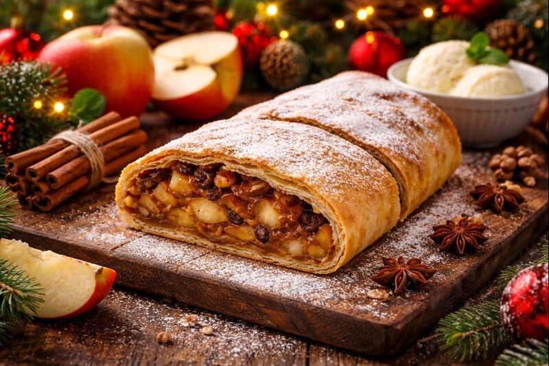 Удивите своих близких и гостей на рождественском празднике с помощью классического яблочного штруделя. Этот невероятный десерт из тонкого теста с ароматной начинкой из яблок, изюма и корицы наполняет атмосферу теплом и уютом, а его сладкий запах создаст настоящее ощущение праздника в доме.