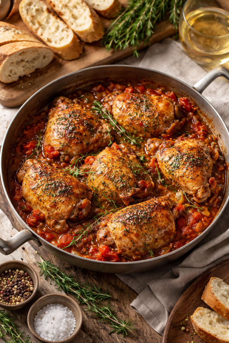 Этот метод раскрывает всю красоту прованского подхода к кухне — от жарки до созревания ароматов. Подавайте курицу с картофелем, полентой или просто с теплым хлебом, собирая соус до последней капли.
