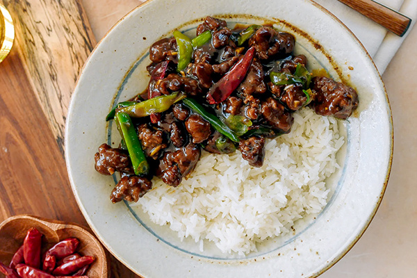 В домашней кухне такая комбинация часто воспринимается как стир-фрай в ресторанах: соевый соус, сахар, немного темного соевого соуса для насыщенного цвета, имбирь, чеснок и зелёный лук — всё это быстро готовится на сильном огне. В этом рецепте используются не ломтики стейка, а фарш, обваленный в крахмале и обжаренный до золотистой корочки.