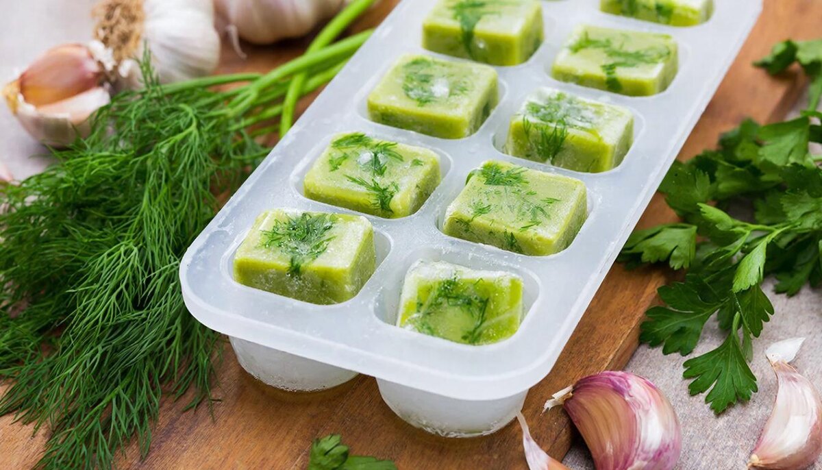 1. Замороженная зелень: Мелко нарезанные укроп, петрушку или кинзу можно залить оливковым или подсолнечным маслом и заморозить. Такие кубики отлично подходят для быстрых супов и соусов.