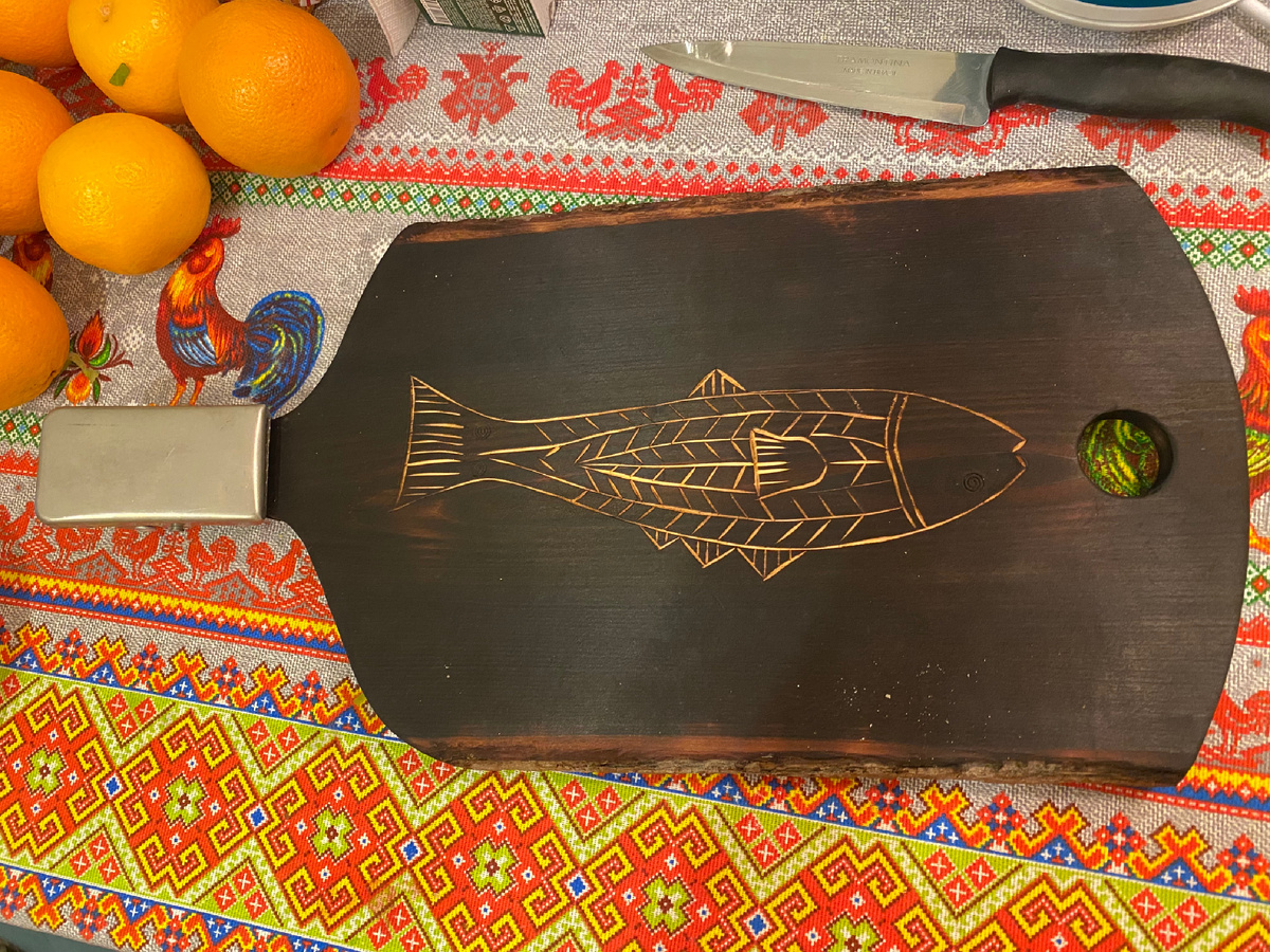 С уверенностью можно рекомендовать мастера Диму, который создал эту замечательную доску, всем кулинарам и любителям рыбалки. А также стоит отметить, что на канавинском рынке всегда можно найти качественную рыбу для идеального блюда.