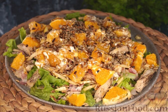 В этом сезоне настоящим хитом можно назвать салат с курицей, сельдереем и апельсином. Нежное куриное филе с добавлением жареного корня сельдерея и хрустящих семечек подсолнечника, а также необычной заправки создаёт интересное сочетание, которое приятно удивляет. Попробуйте!