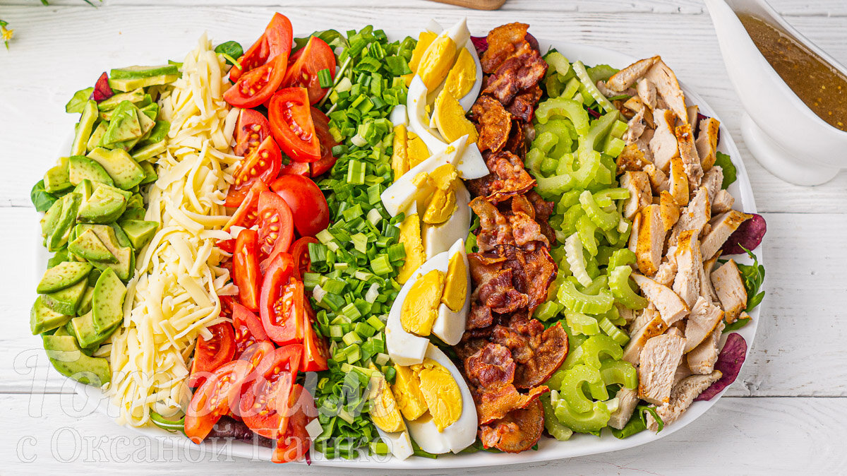 Салат Кобб обязательно станет центром внимания на любом праздничном столе, благодаря своим ярким цветам и гармоничному вкусу. Он подается без майонеза, что делает его легким и диетическим вариантом блюда.