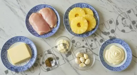 Ананасы необходимо отжать от сиропа и также нарезать на мелкие кубики. Твёрдый сыр лучше натереть на крупной терке для достижения более мягкой текстуры. Все ингредиенты нужно тщательно смешать в глубокой посуде, добавив чеснок, предварительно пропущенный через пресс, и заправку из майонеза, смешанного с небольшим количеством чёрного перца.