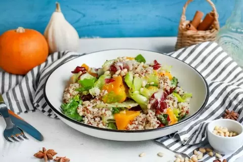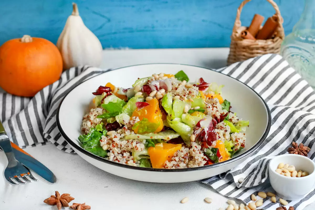 В осенний период, когда хочется чего-то согревающего и вкусного, теплыми салатами можно удивить даже самых требовательных гурманов. Один из таких рецептов – салат с пряным киноа, тыквой и медовой заправкой, который буквально наполняет атмосферу домашним уютом и теплом.