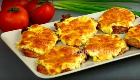 В отдельной миске смешивают майонез, сметану и дижонскую горчицу, добавляя натертый чеснок по вкусу. Затем эту однородную массу равномерно наносят на каждый кусочек мяса. И, наконец, посыпают тертым сыром.