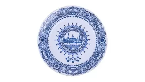 Фаянсовая тарелка с надписью «Политехническая выставка в Москве. 30 мая 1872 года. А. Гашедуа» представляет собой один из памятных предметов, приуроченных к событию, отмечавшему 200-летие со дня рождения Петра Великого.
