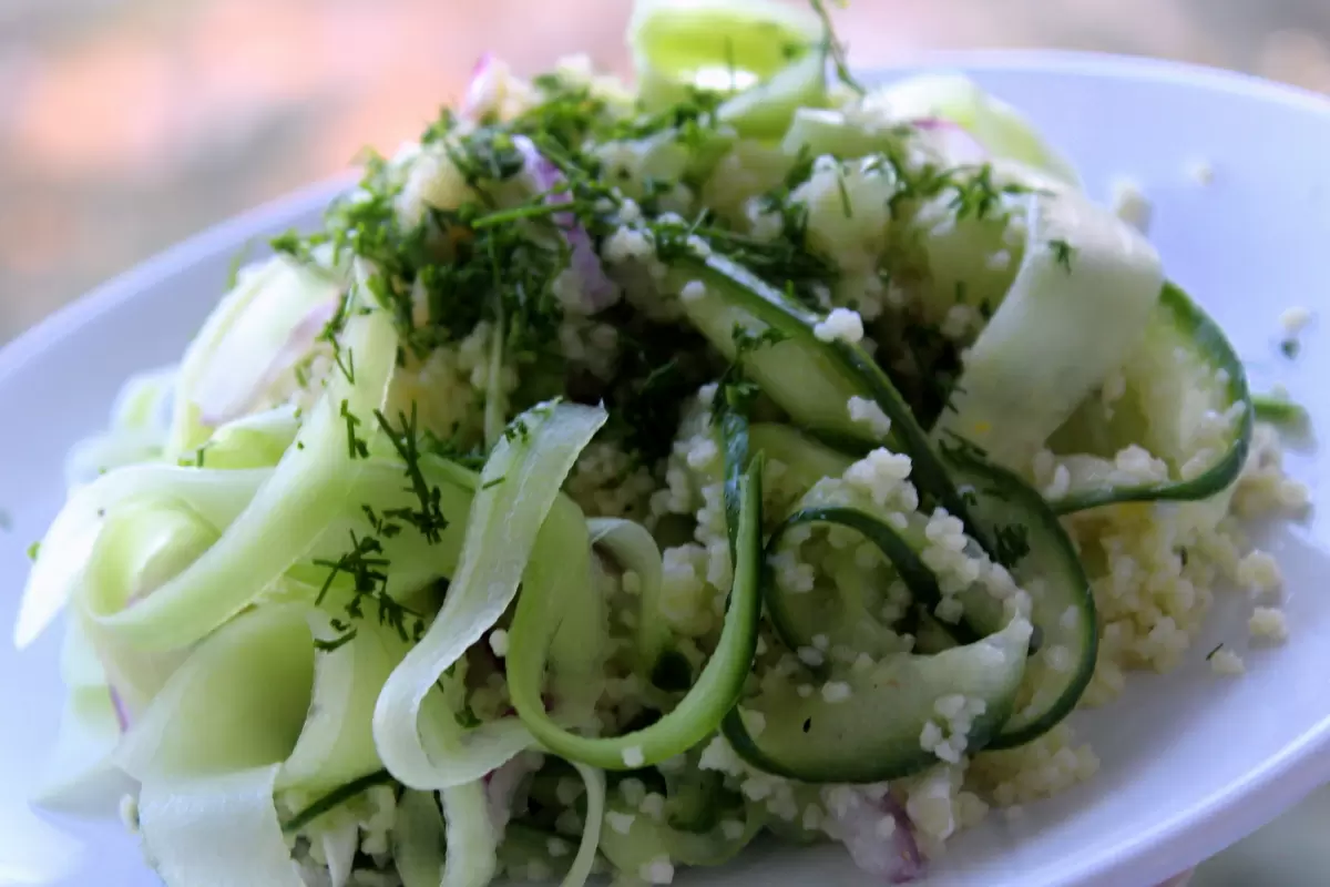 Огурцы нарезать тонкими полосками, а лук — полукольцами. В глубокой миске смешать кускус, лук, изюм и огурцы, затем полить все ранее приготовленной заправкой.