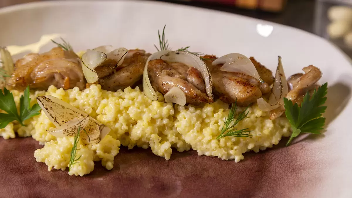 В завершение, полейте пшенку сливками и добавьте бульон по вкусу. Перемешайте и перенесите часть каши на тарелку. Сверху выложите жареное мясо и обжаренный лук, декорируйте веточкой розмарина для контраста.