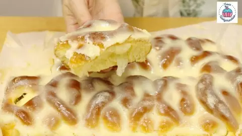 Пока пирожки печутся, смешать густую сметану с сахаром по вкусу и хорошо размешать. Как только пирожки готовы, вынуть их из духовки и покрыть сметанной заливкой. После этого снизить температуру до 150°C и вернуть форму в духовку на 30-40 минут, чтобы сметана пропитала пирожки и приобрела кремообразную текстуру.