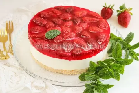 Клубнику аккуратно промойте, удалите хвостики и нарежьте ягоды пополам. Разложите их в форме на слое крема. Приготовьте клубничное желе по инструкции на упаковке, дайте немного остыть и аккуратно вылейте на клубнику, чтобы она полностью покрылась этим великолепным напитком.