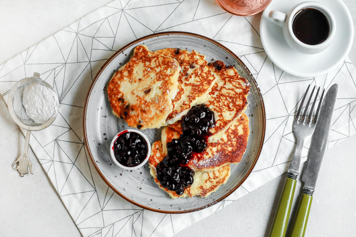 Готовые оладьи лучше всего подавать сразу же, полив сверху ароматным соусом из черники. Это лакомство точно порадует всех, кто его попробует! Приятного аппетита!