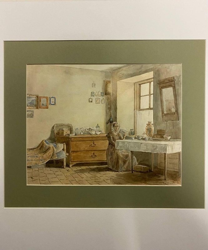 Одной из самых ранних работ является акварель 1850 года, выполненная художником Корнеевым. На полотне изображена женщина, наслаждающаяся чаем у самовара. Образ нее таит в себе загадку: неизвестно, кто она и какова ее связь с автором, но излучаемое изображением тепло и уют оставляет зрителей в раздумьях.