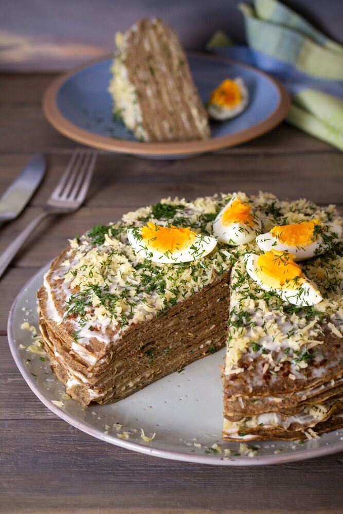 При сборке тортов каждый блин смазывают майонезом, посыпают укропом и натертым сыром, выкладывая блины друг на друга. Торт можно украсить вареным яйцом.