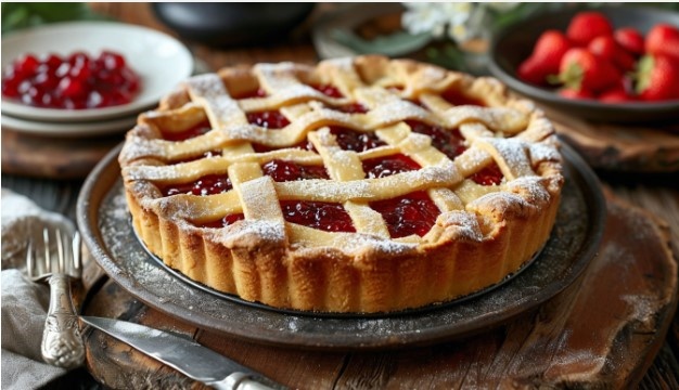 Далее разогрейте духовку до 180 градусов и приготовьте разъемную форму. Раскатайте 2/3 теста для создания основы и немного подпечите его. Оставшееся тесто используйте для бортиков. Приложите бортики к основе, закрепите все желтком и заполните начинкой. Украсить пирог можно по желанию, например, нарезаллами теста, чтобы создать знакомую решетку. Наконец, выпекайте при 200 градусах 10 минут, а затем еще 1 час при 160 градусах.