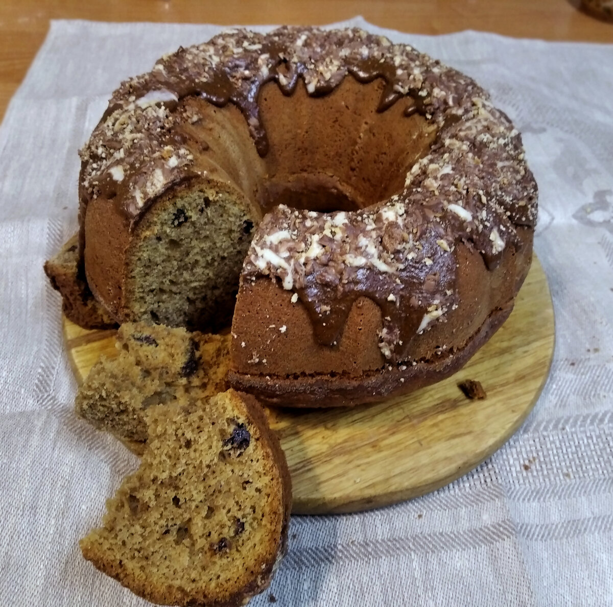 Для глазури смешиваем сахар, растворимый кофе и воду. Доводим до кипения на маленьком огне, пока не загустеет. Снимаем с огня и добавляем сливочное масло, тщательно размешиваем. После остывания покройте глазурью остывший кекс и при желании посыпьте дроблёными орехами или тёртым шоколадом.