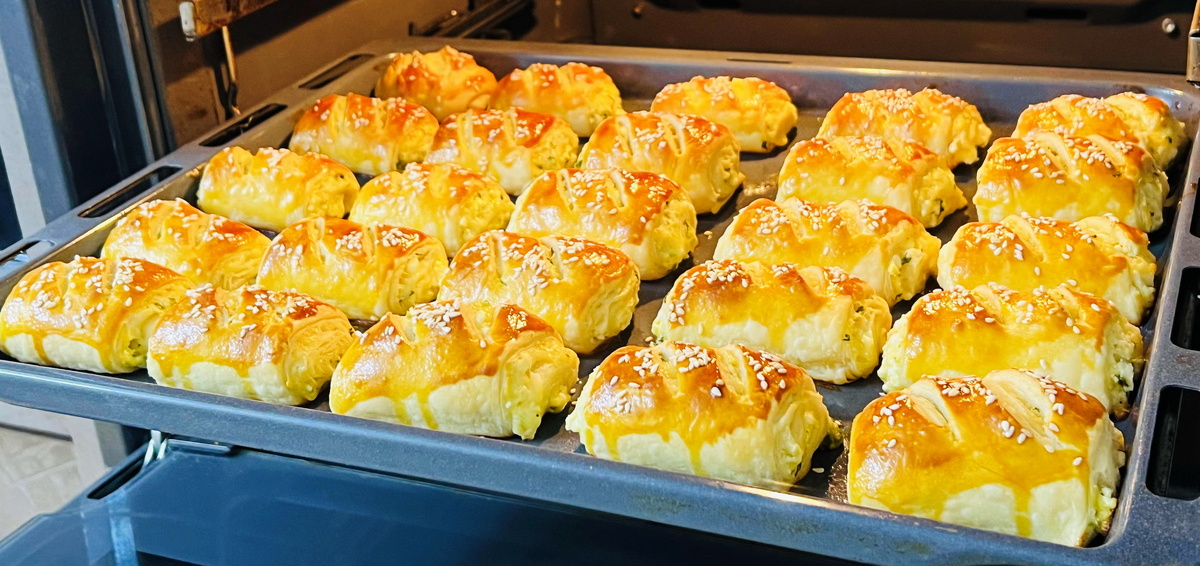 На слои выложите начинку, сверните в рулет и нарежьте на порции. Переложите их на противень, смажьте молоком или желтком, добавьте немного кунжута и сделайте надрезы для красивого оформления. Выпекайте в заранее разогретой до 180 градусов духовке в течение 25 минут.
