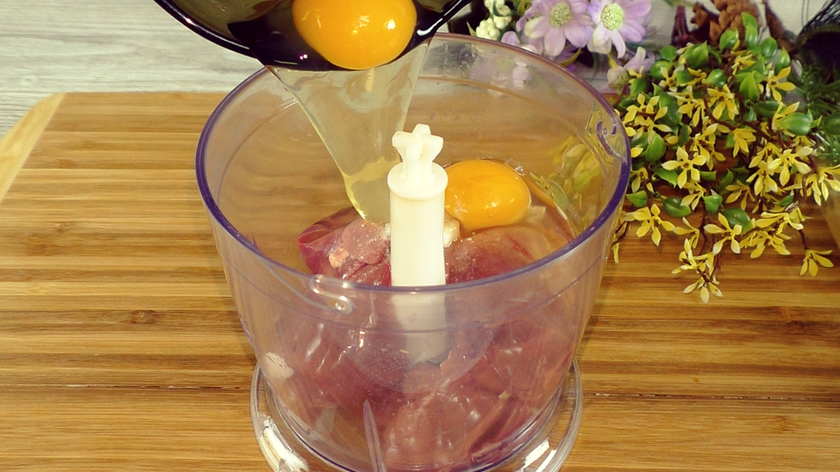 Для начала печень тщательно промывают и помещают в чашу блендера. Половину печенки следует посолить, добавить яйца и измельчить до получения однородной массы. Затем эту массу выливают в глубокую миску.