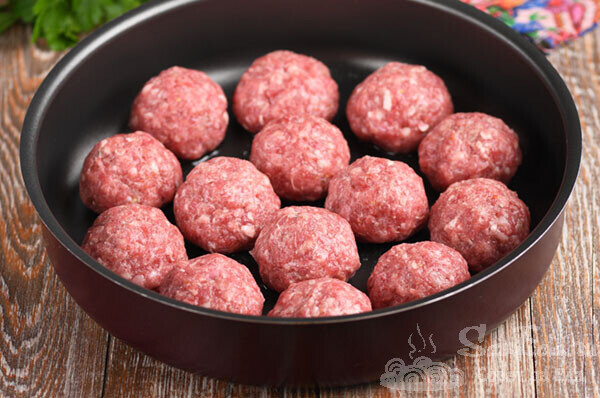 Для этого рецепта потребуется: свиное мясо (700 г), один куриный яйцо, репчатый лук и морковь, а также рис и горох. Прежде чем приступить к приготовлению, рис и горох замачиваются на несколько часов. Затем обжаривают нарезанный лук с натертой морковью, приправляют томатной пастой и заливают водой. В фарш добавляют яйцо, специи и замоченные крупы. Формируются большие тефтели, которые потом тушатся в ароматном соусе до полной готовности.
