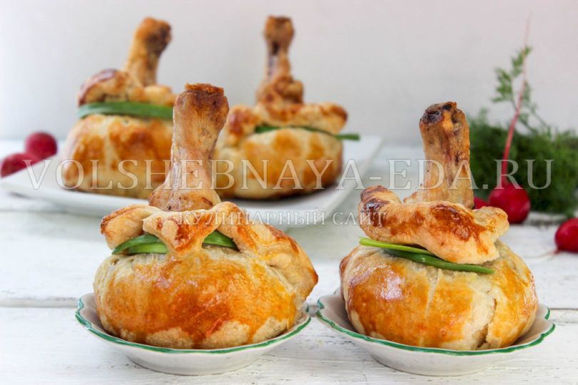 На каждый квадрат положить примерно по 2 столовые ложки начинки и установить ножку вертикально. Подняв края теста, собрать их вокруг голени, зафиксировав форму крепкой нитью или лентой.