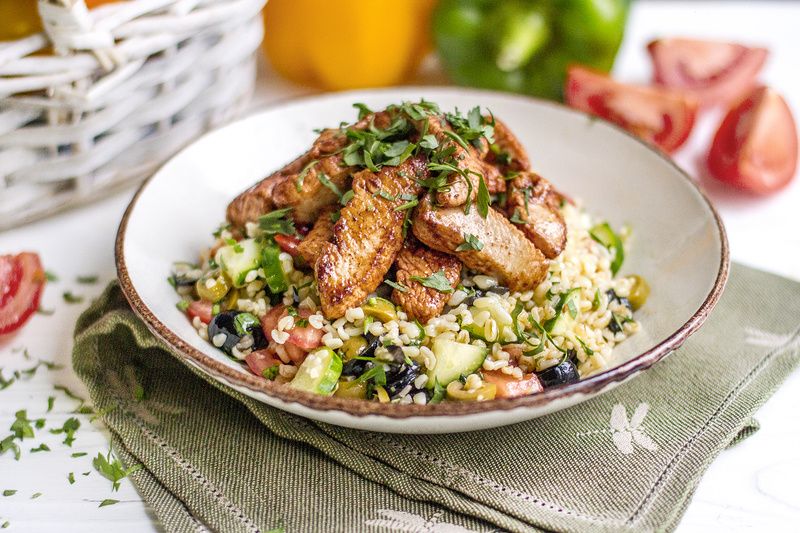 Шаг 3: Огурцы и помидоры нарезать кубиками, маслины и оливки — круглыми ломтиками. Чеснок, кинзу и петрушку также мелко порубить. В большой миске соединить булгур, половину зелени, чеснок, огурцы, помидоры, маслины и оливковое масло. Перемешать, добавить соль по вкусу. Разложить табуле по тарелкам и сверху выложить индейку, предварительно посыпав оставшейся зеленью. Подавайте немедленно!