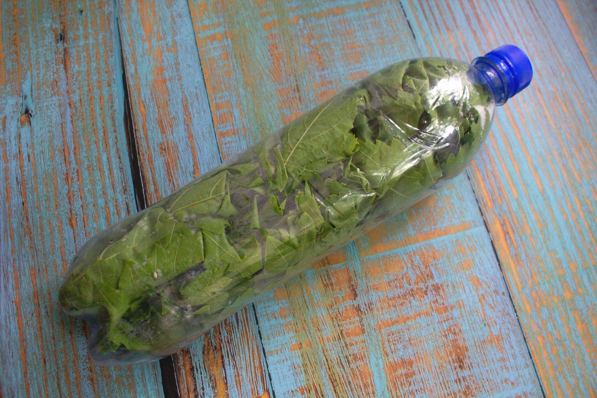 Прежде всего, листья нужно тщательно осмотреть — мыть их не следует, достаточно протереть от пыли. Затем выбираются листья необходимого размера. После этого два листа скручиваются в трубочку и помещаются в пластиковую бутылку.