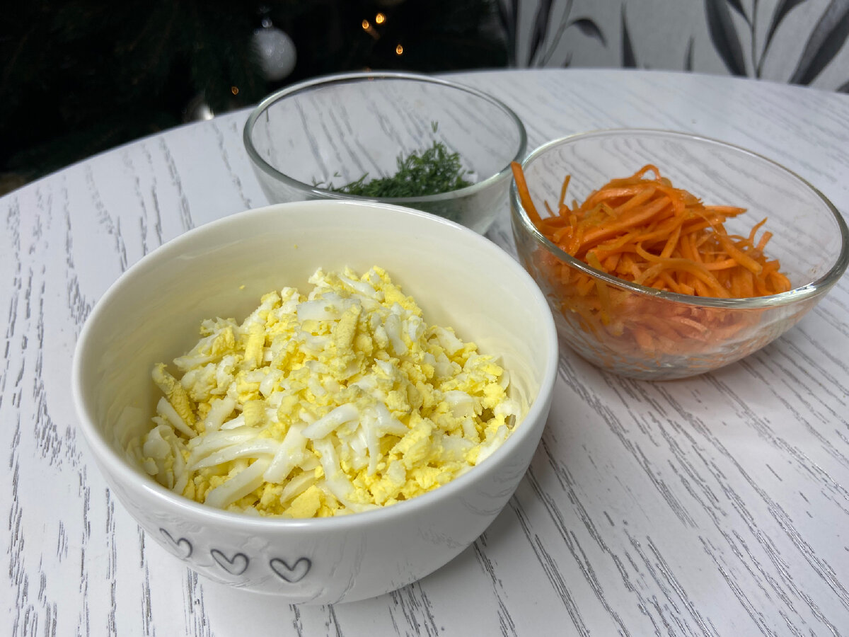 Чтобы подготовить закуску, начните с варки яиц, которые затем следует натереть на крупной терке. Какой же ингредиент без моркови по-корейски? Лучше всего использовать домашнюю, но и магазинная подойдет. Если морковь слишком длинная, просто разрежьте ее пополам. Мелко нарежьте свежий укроп для дополнительного аромата.