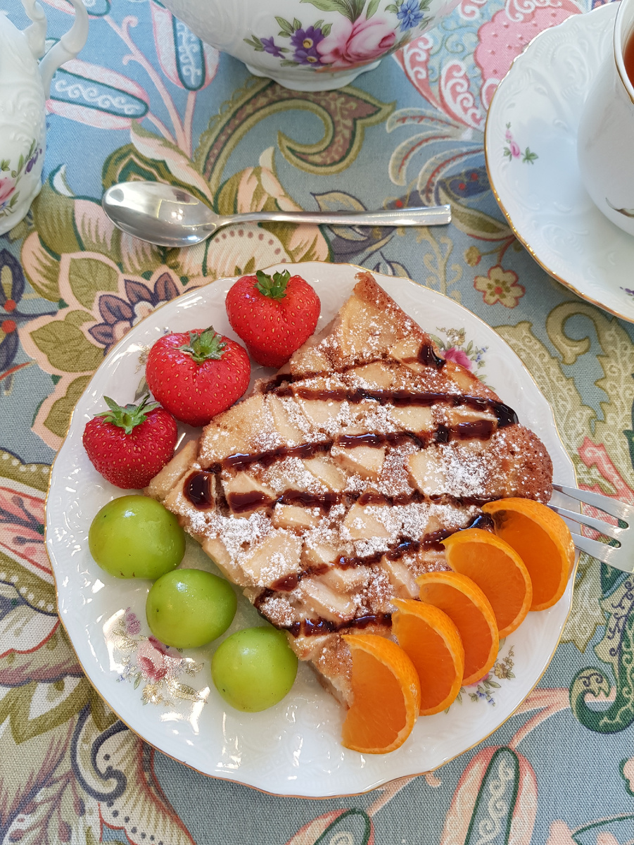Порезать пирог на порции, посыпать сахарной пудрой, полить бальзамическим соусом и дополнить свежими ягодами и фруктами. Обязательно наслаждайтесь!