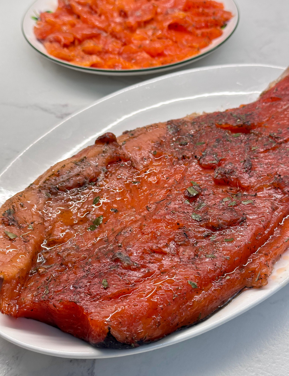 Сыровяленная форель — это рыба, приготовленная с помощью соли и специй без термической обработки. Благодаря этому методу, рыба сохраняет свою плотную текстуру и насыщенный вкус, поражая даже самых привередливых гостей. Блюдо сильно дольше сохраняется по сравнению с просто слабосолёной рыбой, и идеально подходит для множества блюд: закусок, салатов, пасты или даже завтраков в стиле отелей.