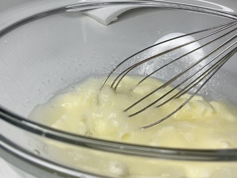 Сначала нарежьте масло кубиками и поместите его в подходящую миску. Залейте горячей водой и тщательно перемешайте, чтобы масло распустилось. Если оно полностью не растворится — не беда, это не повлияет на конечный результат.