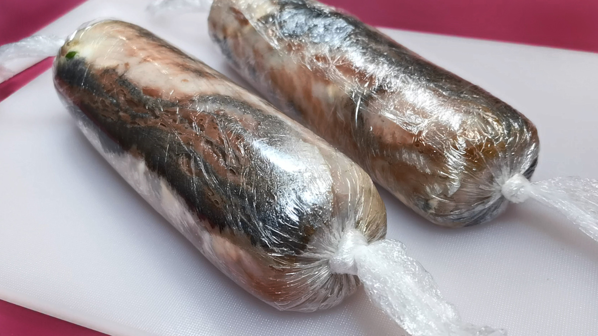 На каждом из отбитых филе равномерно уложите начинку, затем аккуратно сверните в рулет и оберните пленкой, скрепив концы, как фантики. Получившиеся рулеты уберите в морозильник на четыре часа. Это позволит им затвердеть и упростит нарезку.