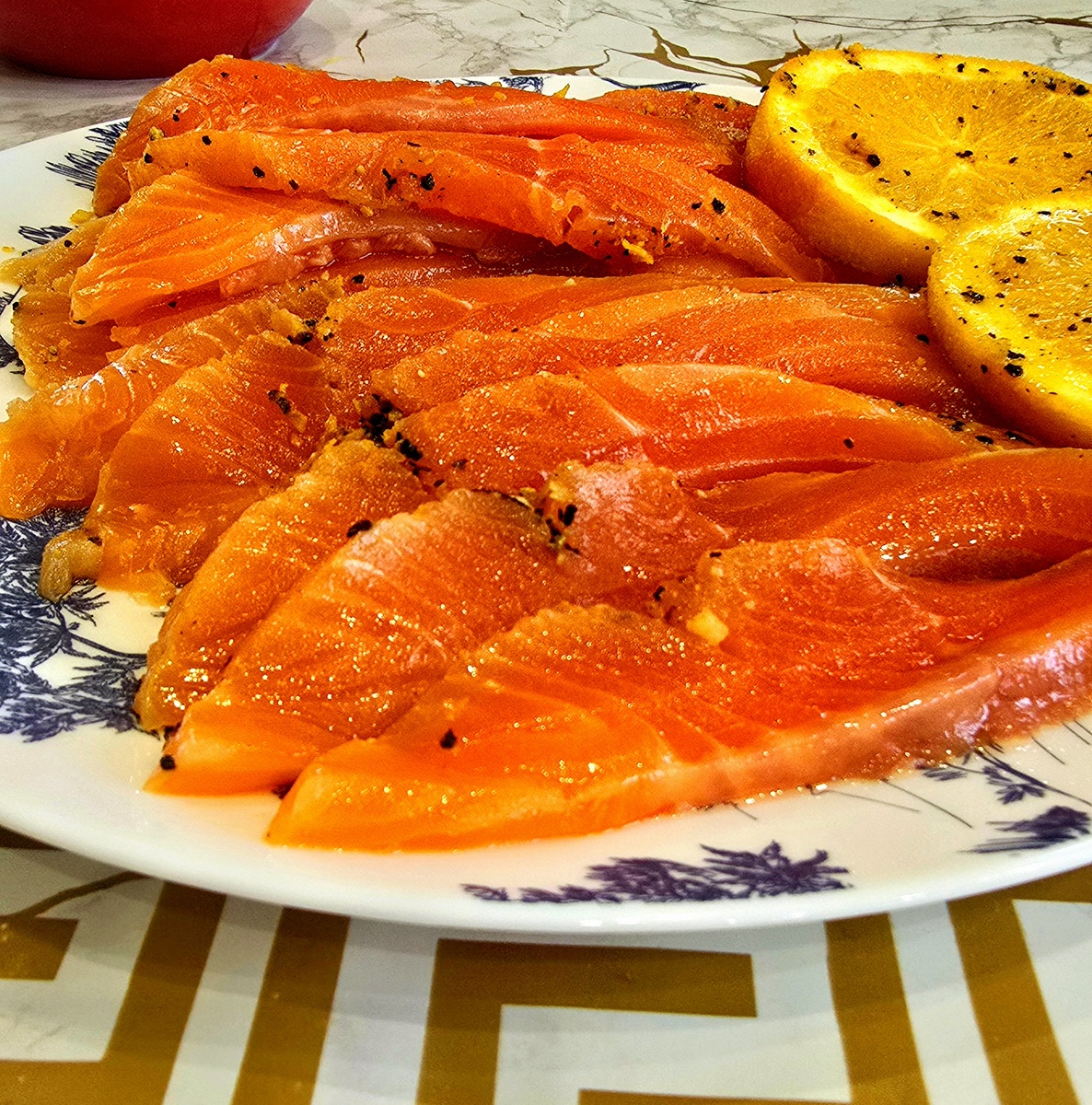 Как альтернативу лимонному перцу можно использовать смесь дробленных перцев (черный, белый, душистый, розовый и зеленый) в комбинации с базиликом или укропом. Дробленые специи добавляют гравлаксу необходимую пикантность. Далее рыбные филе укладываются в глубокую посуду, сверху размещаются кружки апельсина и накрываются фольгой. После этого гравлакс отправляется в холодильник на сутки. Если остается много, его можно заморозить, что позволяет сохранить свежесть на длительное время.