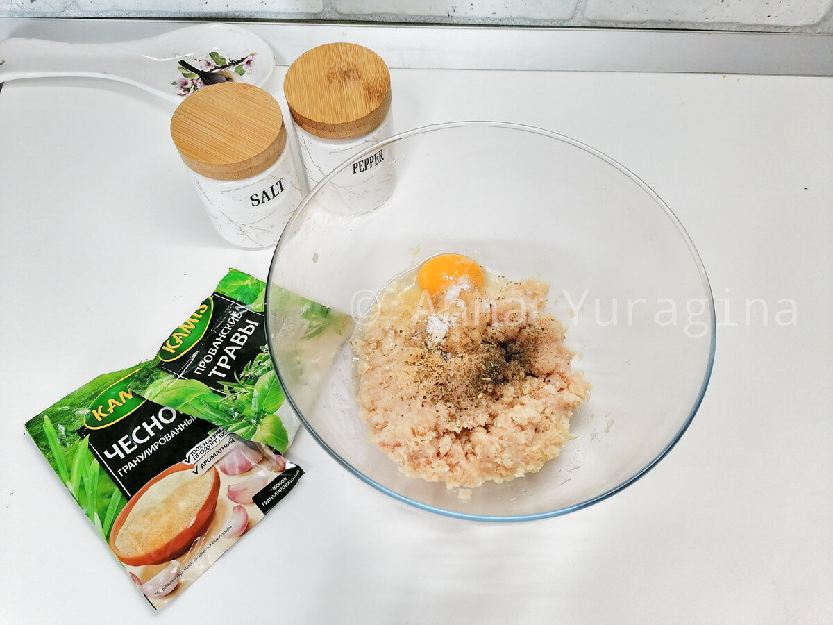 1. В куриный фарш добавить сырое яйцо, соль и специи. Тщательно перемешать и отбить, чтобы фарш стал более однородным.