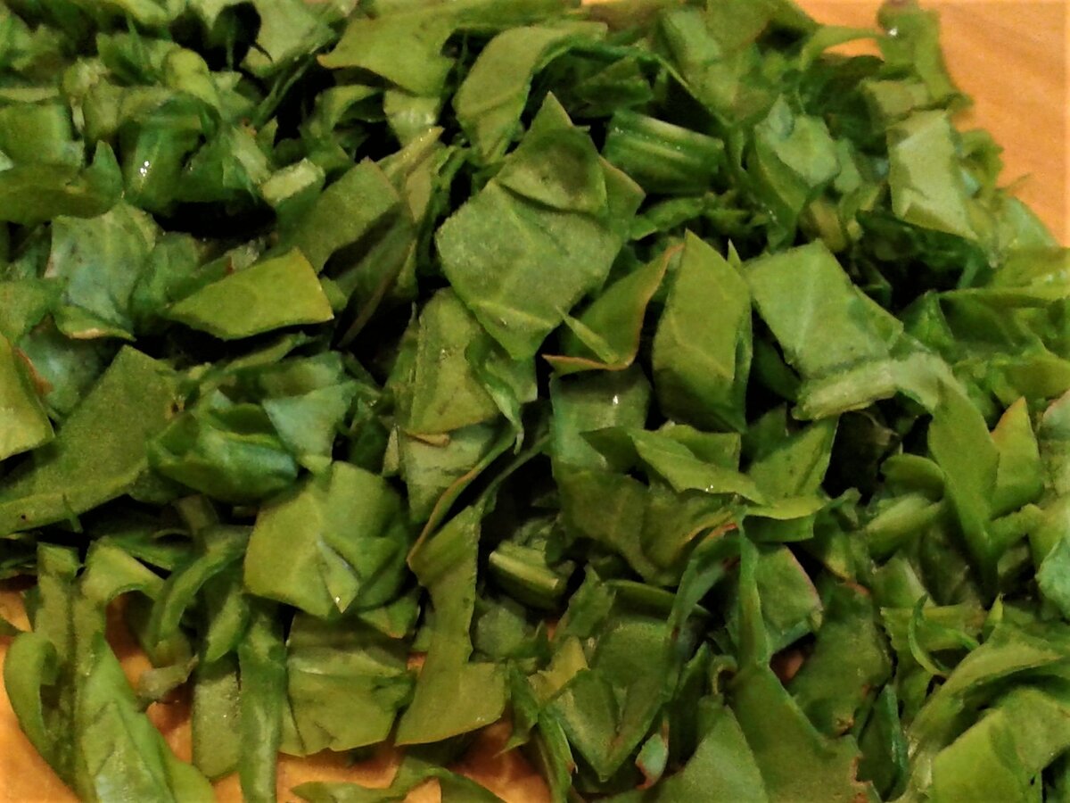 - Нарезать щавель небольшими кусочками. Шпинат можно использовать в любом виде — как свежий, так и замороженный. Если используются листья, добавьте их к картофелю за минуту до готовности.