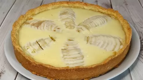 Груши очистите от кожуры и нарежьте тонкими пластинами. Дно формы диаметром 22 см застелите пергаментом, затем выкладите тесто по дну, формируя небольшие бортики. Равномерно распределите по тесту нарезанные груши, залейте их приготовленной сметанной заливкой, чтобы она полностью покрыла фрукты.