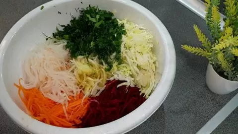 - Редька Дайкон: 200 грамм, нарезанная аналогично моркови.