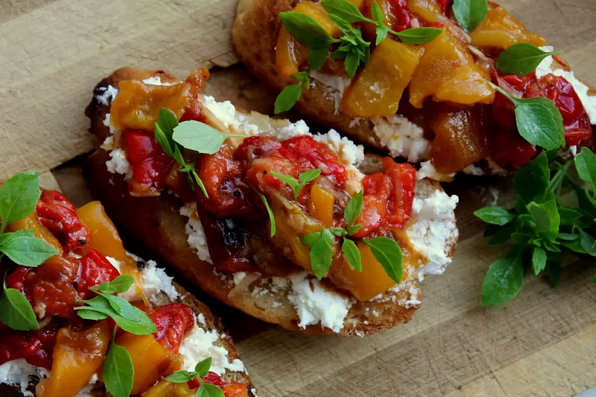 Брускетты с запечённым перцем — это закуска, которая способна удивить любого. Сладкий, маринованный перец в гармонии с нежным козьим сыром создаёт идеальное сочетание, способное рассказать о ярких вкусах и ароматах средиземноморской кухни.