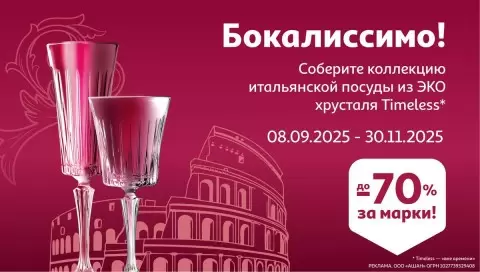 В период с 8 сентября по 16 ноября настоящие ценители эстетики и качества могут насладиться особым предложением на коллекцию итальянской посуды из экологичного хрусталя Timeless. Уникальная акция дает возможность получить скидку до 70% за накопленные марки за каждую покупку на сумму 400 рублей.