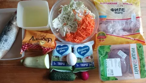 Для начала следует озвучить, что было в запасах: скумбрия, куриные и индейские филе, свежая капуста, тертая морковь, огурцы, редис и даже немного кабачка. Не выступили в роли лукавых помощников и привычные для кухни продукты — яйца, творог и мука. Благодаря этому списку составлено разнообразное меню, готовящееся с минимальными усилиями.