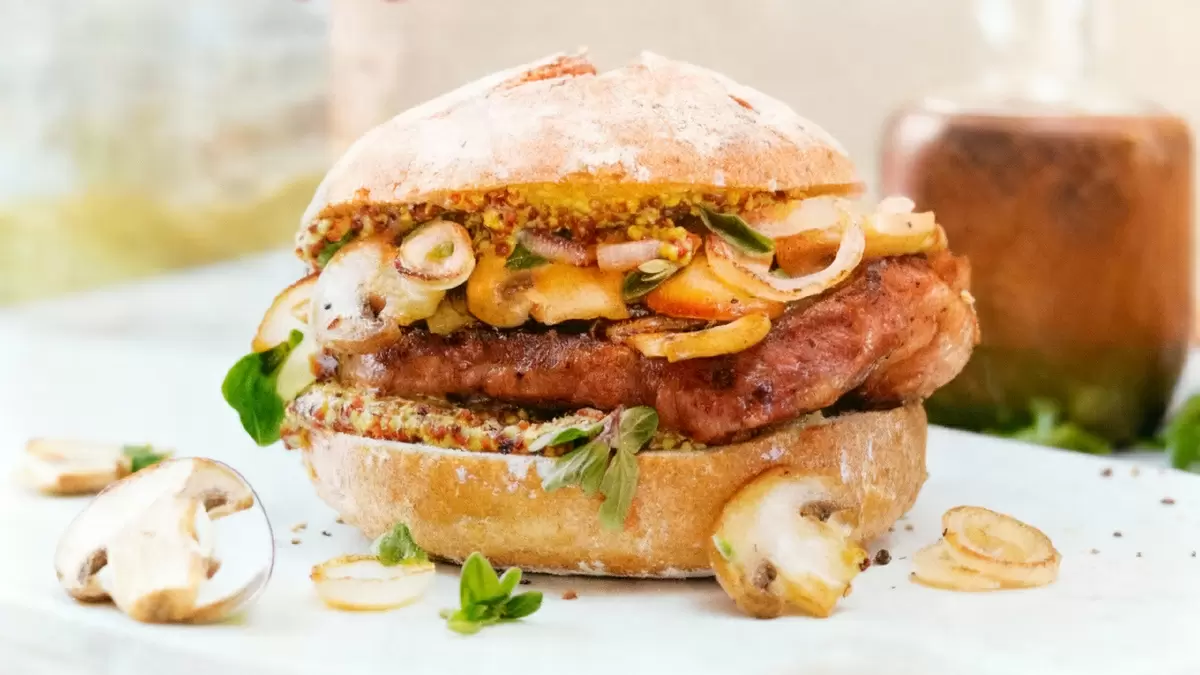 Разрежьте ржаные булочки пополам. Нижнюю часть намажьте зернистой горчицей, а затем положите горячие шницели. Украсить бургер можно жареными шампиньонами и луком. Завершите композицию свежими листьями майорана и накройте верхней половиной булочки.