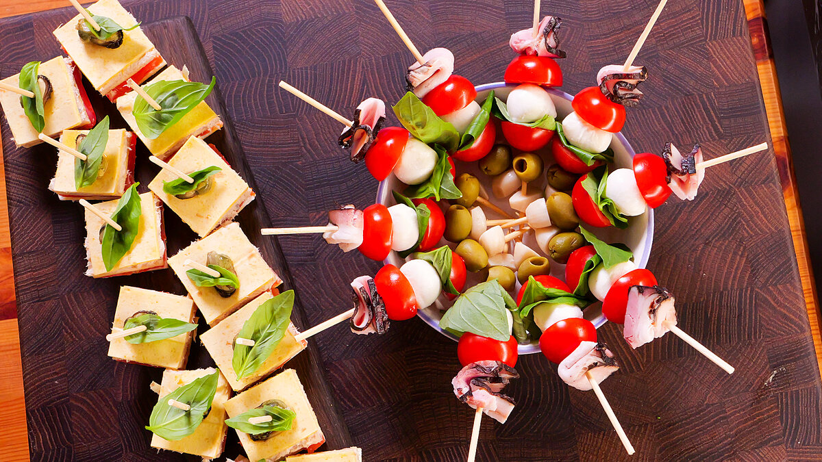 Приготовление: Начинать следует с нарезки бекона на небольшие кусочки, а зубчики маринованного чеснока разрезать пополам. Каждый кусочек бекона свернуть и проткнуть шпажкой. На шпажку последовательно нанизываются половинка помидорки черри, шарик моцареллы и листик базилика. Далее снова следует нанизать половину томата, оливку и закончить всё маринованным чесноком.