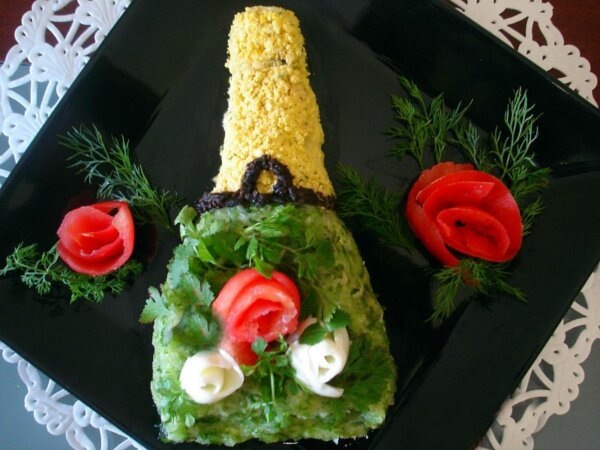 При подаче салат выкладывают на овальную тарелку и формируют в виде бутылки. Огурец натирают на терке для украшения нижней части, а горлышко обсыпается раскрошенными желтками. Пробку можно изготовить из белка — она будет выглядеть как шапочка. Из маслин формируют ободок вокруг горлышка, а для особого акцента можно добавить надпись майонезом. Такой ненавязчивый кулинарный шедевр не только украсит ваш стол, но и подарит множество положительных эмоций всем собравшимся!